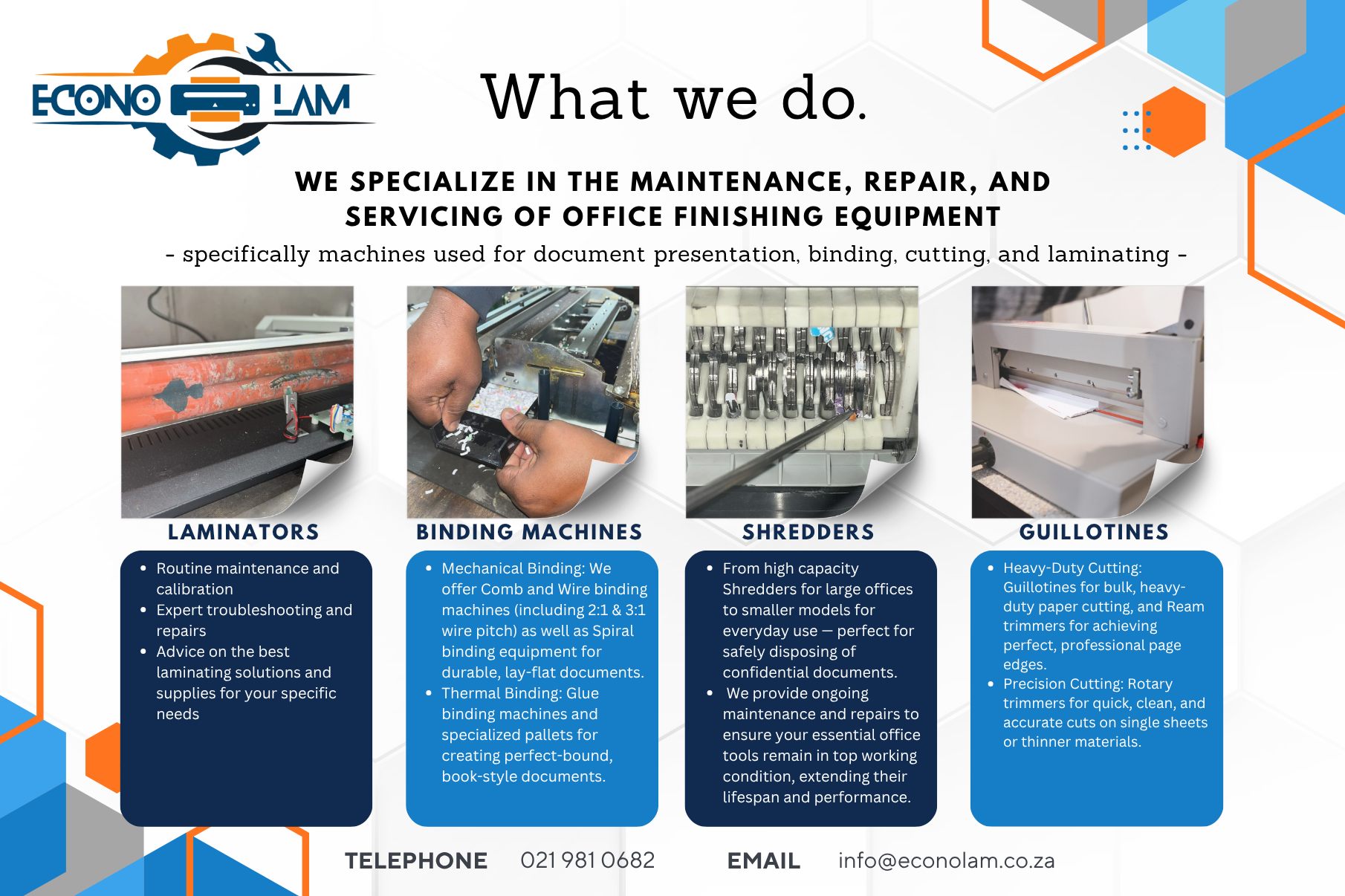 Repairs and Maintenance are an important service to ensure reliable and continued use of machinery, equipment and consumables. At Econo-lam we pride ourselves in going the extra mile to provide a customer confident environment for good future relations.